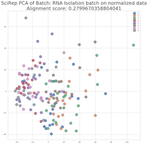 如下图所示,可以通过knn_score计算出以batch信息所谓label时scirep数据的alignment score。0.27996表示不同batch的分离程度比较差,基本混合在一起